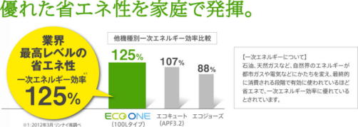 一次エネルギー効率は、エコキュート・エコジョーズと比べて、かなり高くなっているので、とても経済的です。