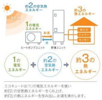 エコキュートとは、エコキュートは「空気」を使って効率良くお湯を沸かす給湯機で、地球環境に配慮した給湯機です。